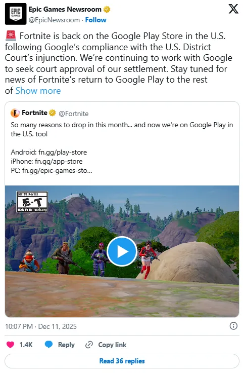 فورتنایت از سال ۲۰۲۰ به خاطر اختلافات حقوقی با گوگل – عمدتاً بر سر کمیسیون ۳۰ درصدی پلی استور – از این فروشگاه حذف شده بود. حالا، پس از حکم دادگاه و توافق اولیه، کاربران آمریکایی میتونن مستقیم از گوگل پلی دانلود کنن و دیگه لازم نیست فایل APK رو sideload کنن. Epic اعلام کرده که “در حال همکاری با گوگل برای تایید نهایی settlement هستیم تا انتشار جهانی هم ممکن بشه”.