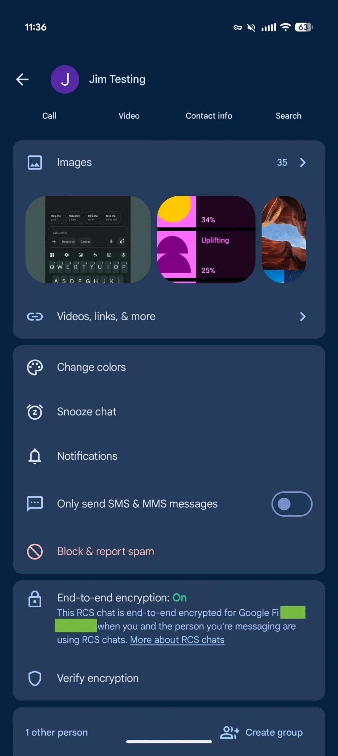 - ورود به صفحه جزئیات مکالمه: در اپلیکیشن گوگل مسیجز، با ضربه زدن روی نام مخاطب در نوار بالایی، به صفحه “جزئیات” بروید.