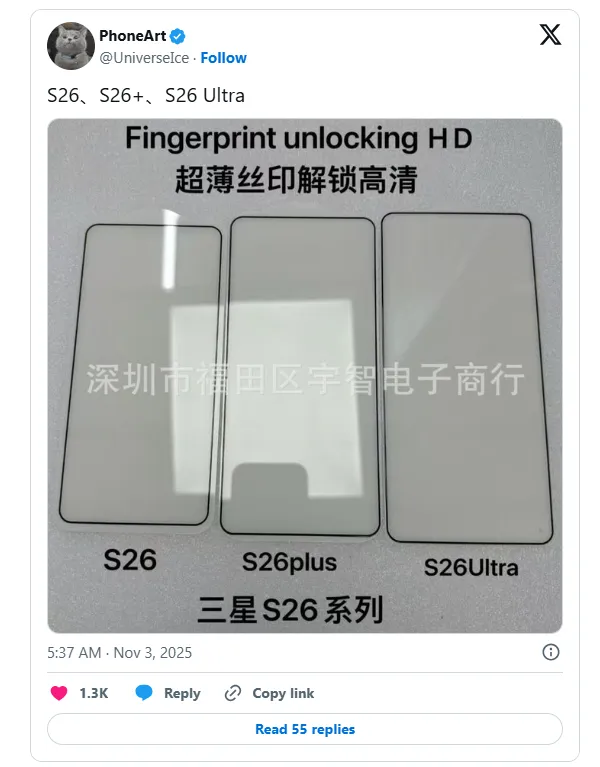 به گزارش ایروتایم – irotime، تصاویر جدیدی از محافظهای شیشهای حرارتدیده (tempered glass) برای سه مدل گلکسی S26، S26+ و S26 Ultra در شبکههای اجتماعی چین لو رفته است. این تصاویر، که توسط لیکر معروفی به نام Ice Universe (با نام کاربری @UniverseIce) منتشر شده، اولین نگاه واقعی به طراحی جلویی این گوشیها را ارائه میدهد. برخلاف آنچه در ابتدا شایعه شده بود، سامسونگ ظاهراً برنامههای خود برای بازطراحی اساسی خط تولید پرچمداران را کنار گذاشته و به جای آن، بر روی یکپارچگی ظاهری تمرکز کرده است.
