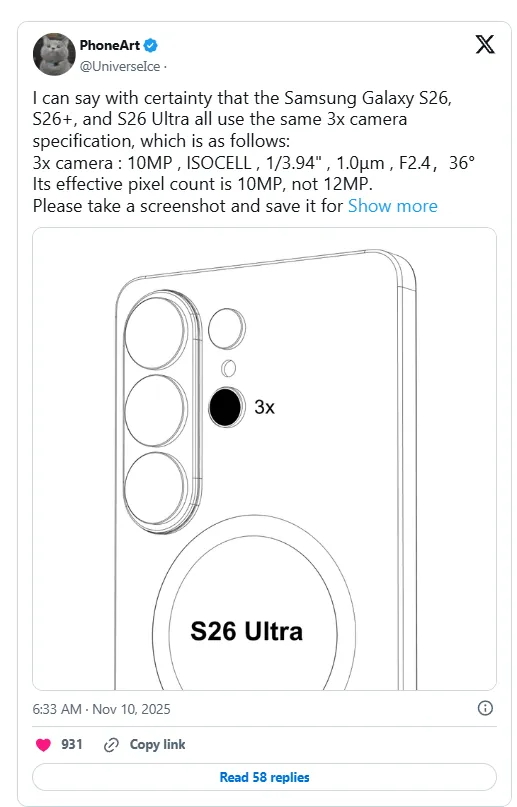 وقتی حرف از دوربین میشود، انتظارات را پایین نگه دارید – حداقل بر اساس leaks اخیر. افشاگر معروف Ice Universe جزئیاتی را فاش کرده که نشان میدهد هر سه مدل S26 از سنسور ۱۰ مگاپیکسلی ISOCELL برای لنز تلهفوتو ۳x استفاده خواهند کرد. این سنسور کوچک (۱/۳.۹۴ اینچ با پیکسلهای ۱.۰ میکرومتر و لنز f/2.4 با زاویه ۳۶ درجه) دقیقاً همان چیزی است که در S25 و S25 Plus دیدیم: کاربردی برای زوم روزمره، اما بدون جادو.
