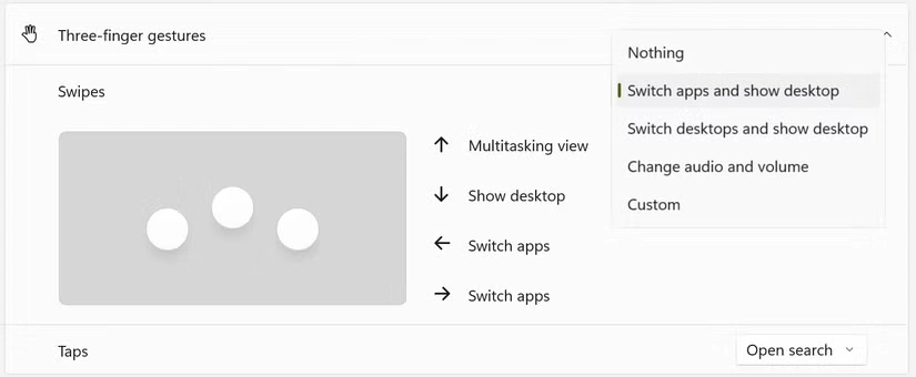 ویندوز به شما امکان میدهد حرکات سه و چهار انگشتی را به دلخواه تنظیم کنید. در منوی حرکات پیشرفته، میتوانید عملکردهایی مانند موارد زیر را به این حرکات اختصاص دهید: